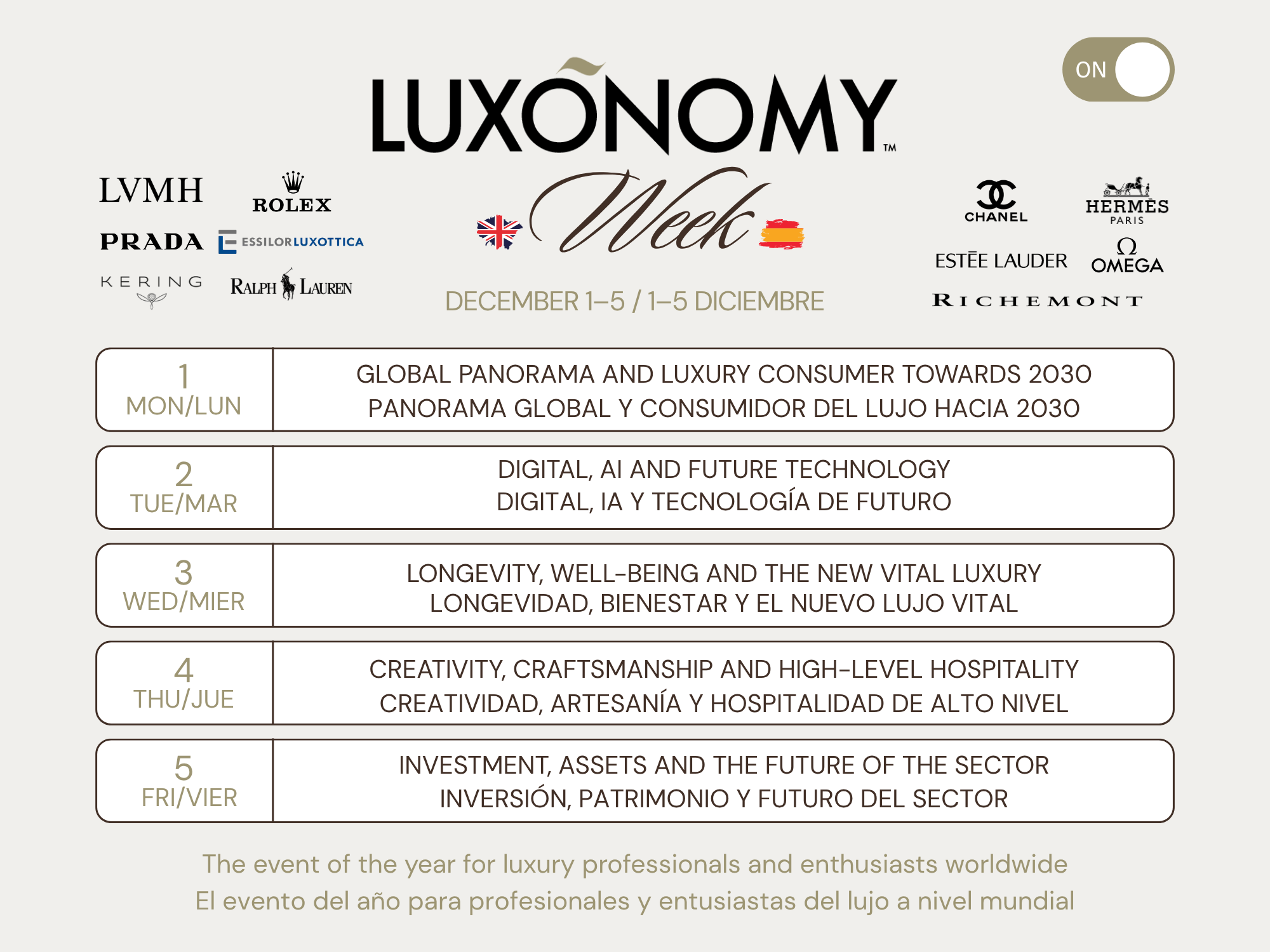 Cinco días, 2 horas al día, online en directo (🕑 14:00–16:00 Madrid) con líderes y visionarios de: moda, joyería, relojería, hospitality, real estate, movilidad premium y tecnología aplicada al lujo.